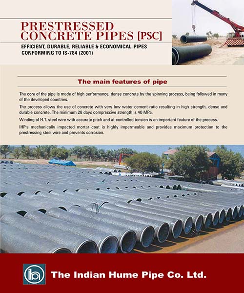 The first major contract for the supply and installation of prestressed concrete pipe line was completed by IHP in the year 1965. Today over 5000 Km of prestressed concrete pipe lines are in service in all major cities in India giving satisfactory service. The Company is involved in several important projects for Water supply , Lift irrigation and Drainage Schemes all over the country.